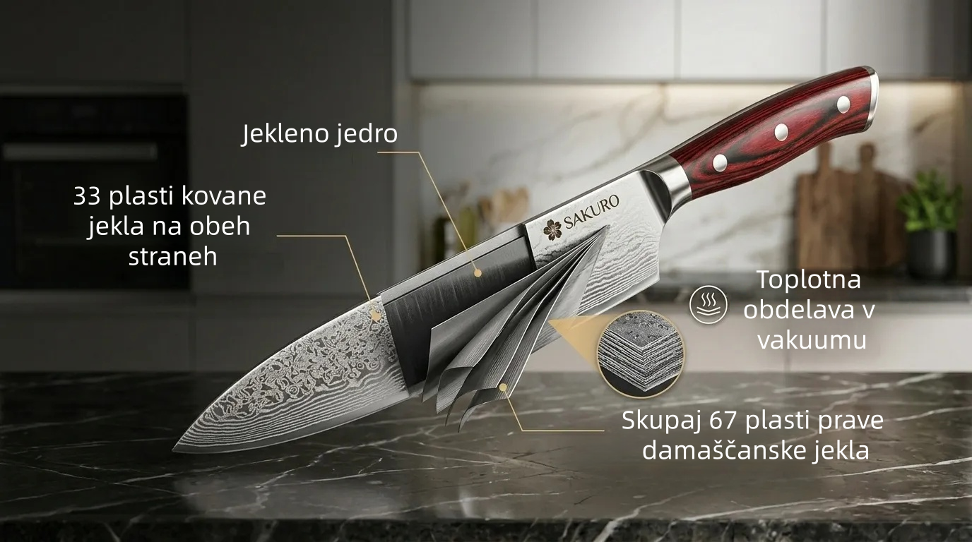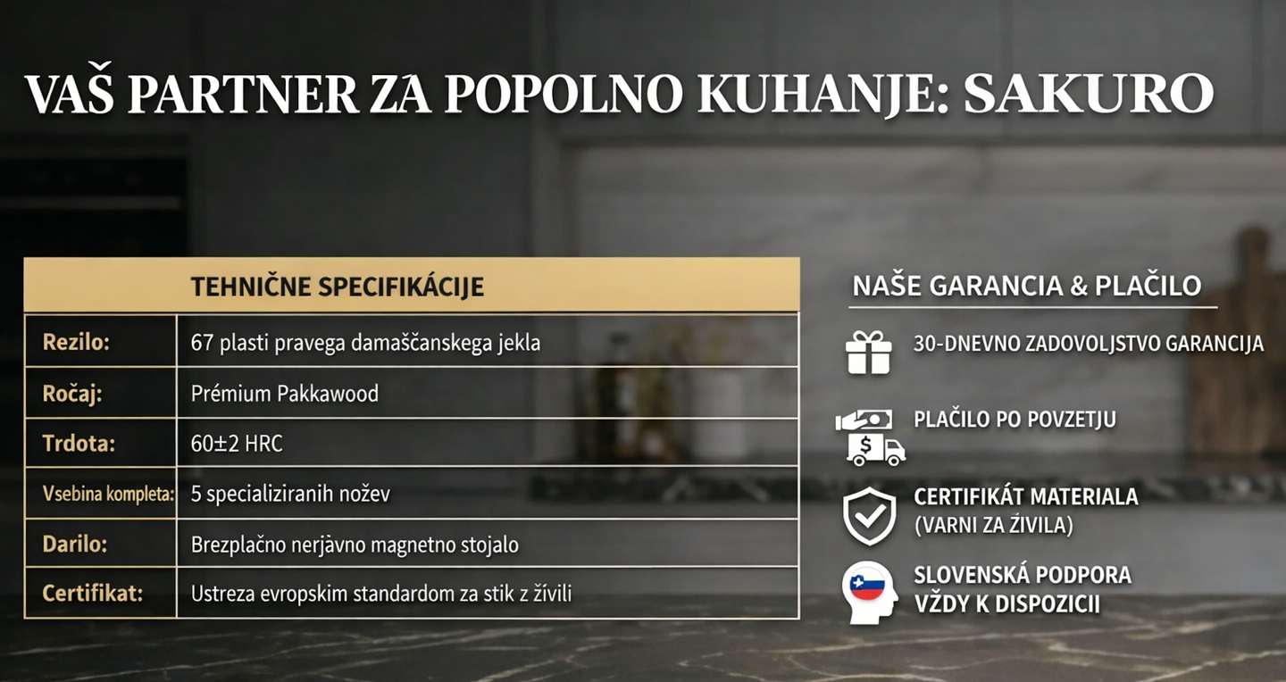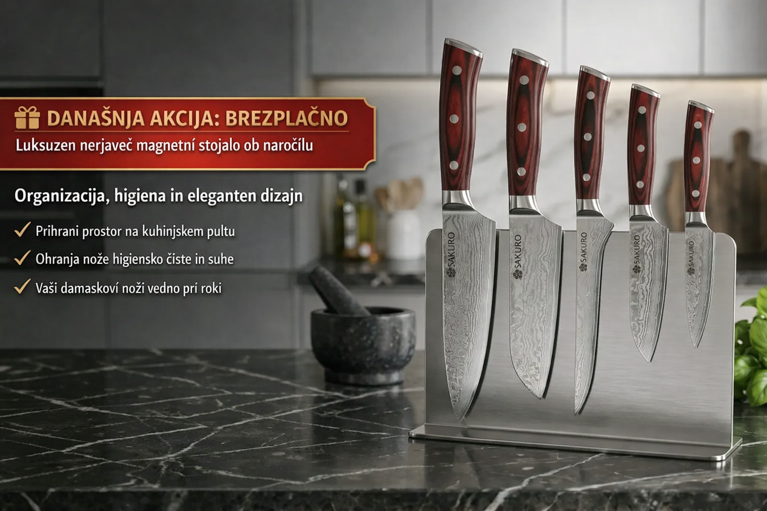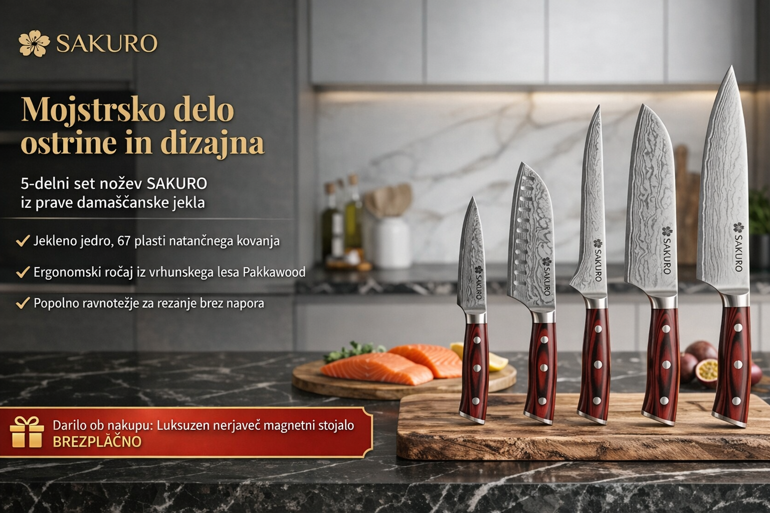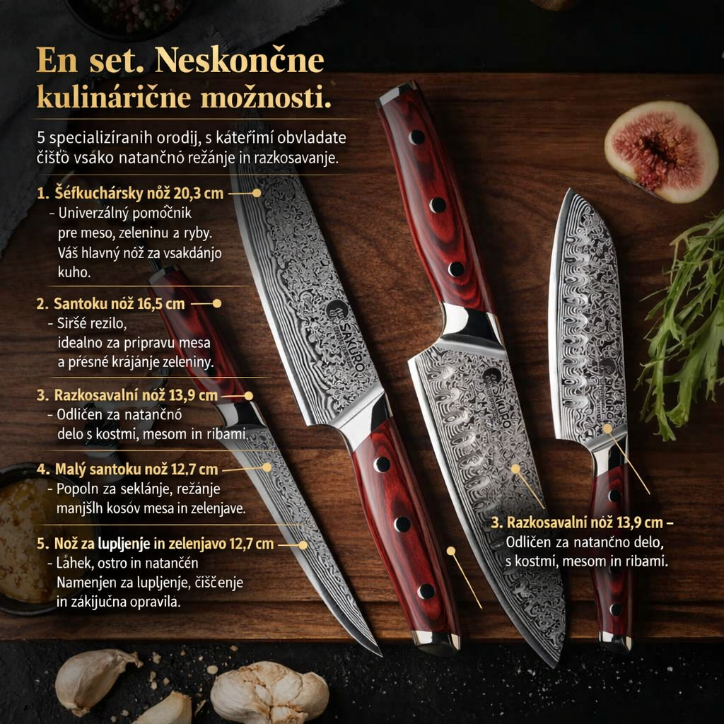 🔪 Luksuzni 5-delni komplet nožev SAKURO iz pravega damaščanskega jekla + 🎁 BREZPLAČNO stojalo